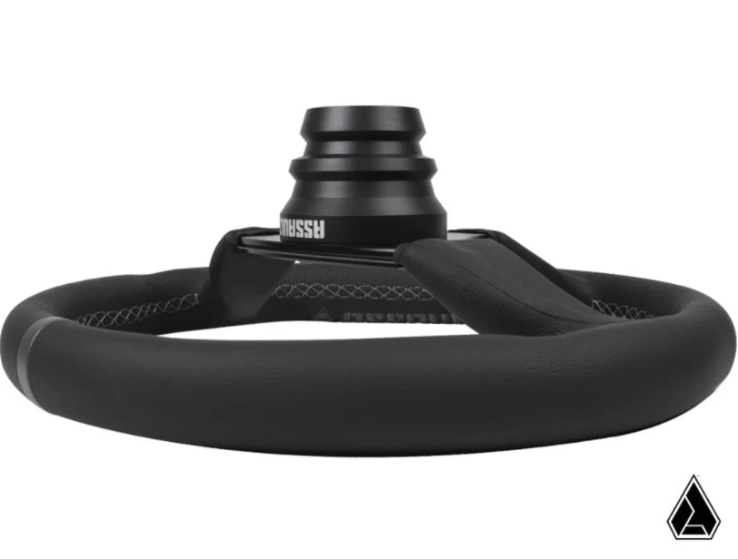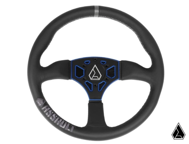 An Assault Industries logo is embroidered in the leather with the same gray stitching. The aluminum center plate features an aluminum laser cut base that offsets the black top plate from the black steering wheel frame and black leather.
