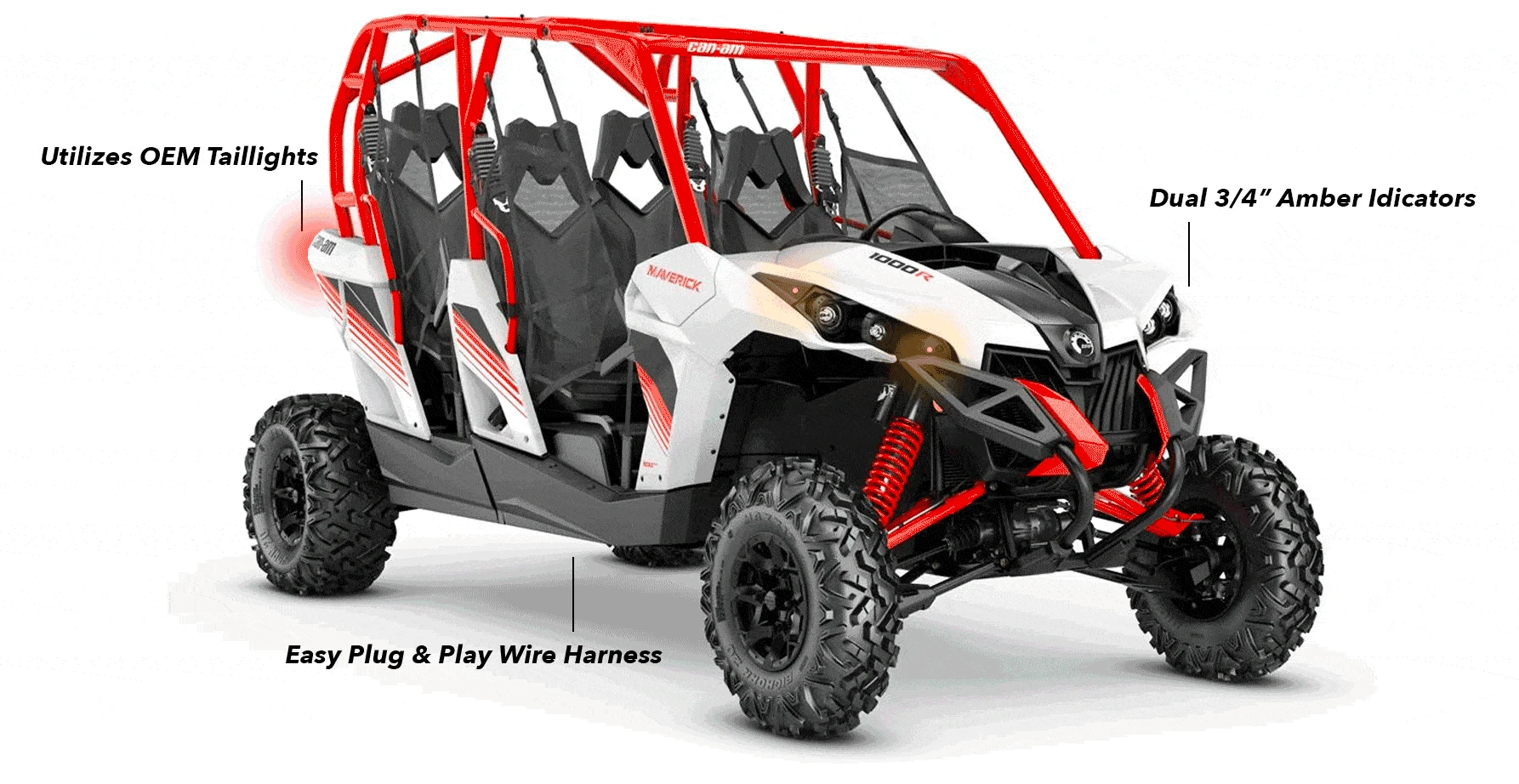 The plug-and-play turn signal kits from Corbin Custom Works are the easiest and highest quality kits for the Can-Am’s “Original” Maverick 1000R UTVs! Our signal kits achieve a completely OEM rear indicator look by utilizing the factory rear tail lights. We include four super-bright 3/4″ LEDs to provide over 180° of front indicator visibility! All turn signal kits also have hazard rocker switch/functionality upgrades available. Each Corbin Custom Works turn signal kit comes with thorough, easy to read and illustrated, installation guides making installation a snap!