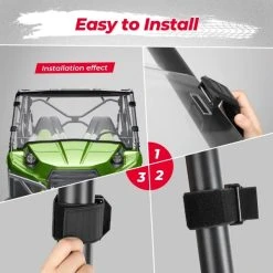 kemimoto windows for UTV polycarbonate front windshields is easy to install no tools required. What you need to do is to pass the buckle through to the roll bar and tighten all straps. It only takes 1 minute to get a scratch resistant clear front windshield.