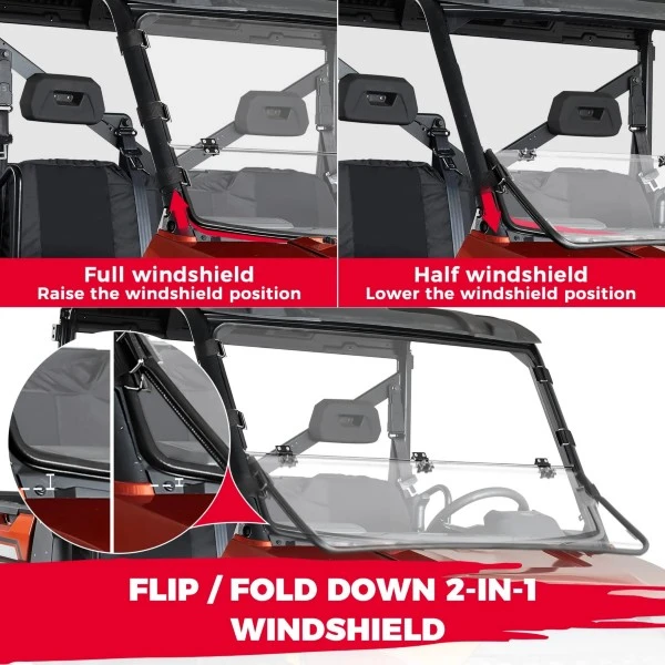 KEMIMOTO Ranger 1000 flip windshield can be switched to the full or half windshield you want by adjusting the installation position of the bottom windshield. Widened self-adhesive straps ensure simple installation & detachment; rubber pads on the windshield firmly connect the windshield clamp and your ranger and prevent friction.