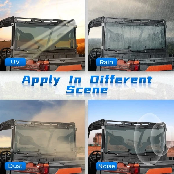 Kemimoto back window in 1/4 thick is made of high-quality PC material, 250X stronger than glass, with the feature of shock-resistance, shatter-resistance, and corrosion-resistance. This back windshield can cope with different situations easily, such as UV, rain, snow, dust, and noise, a good partner for your adventure.