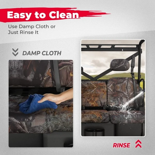 Made of quality 1680D oxford fabric, this utv seat covers are water resistant, protecting your seats from mud, rain and snow. The covers are odorless, frizz free, breakage free, wrinkle free, strong and durable, ensuring a long time performance.