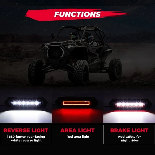 XP 1000 brake light bar is made of high-quality LED. And with 3 working modes: reverse, running & brake. When you brake, the light automatically displays highlight red. If the state is driving, the light is lowlight red. The light is white when reversing, different modes meet your different needs.