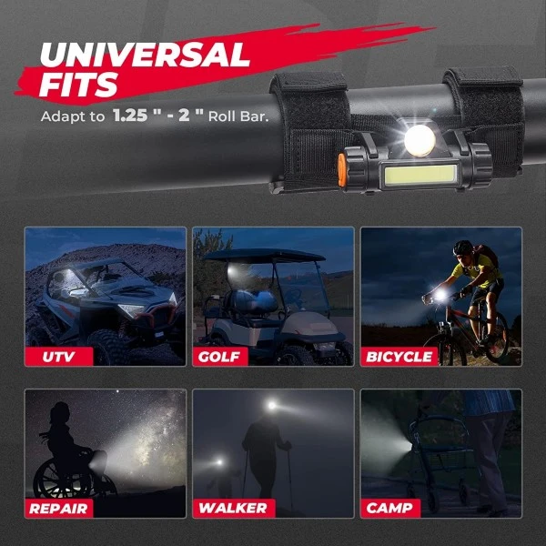 UTV battery dome light 12v can adapt to roll bar range from 1.25″ to 2″, which allows you to install the roll bar light on UTV, ATV, Golf Cart, Kick Scooter, Walker, Rollator, Knee Scooter, Wheelchair, Kick Scooter, Boat, Bike, Camp, and so on. KEMIMOTO UTV roll bar light is compatible with Polaris, RZR, Kawasaki, Can Am, Pioneer models…