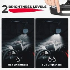 - LIGHT UP YOUR CAP: There are 2 brightness levels for the utv rearview mirror, with soft light in the first gear and brightest light in the second. UTV rear view mirror when switched on in white-light mode, illuminates the cab, making it easy to read the map even at night. The reading light is powered by a built-in battery, providing lighting even when your UTV vehicle is low on power.
