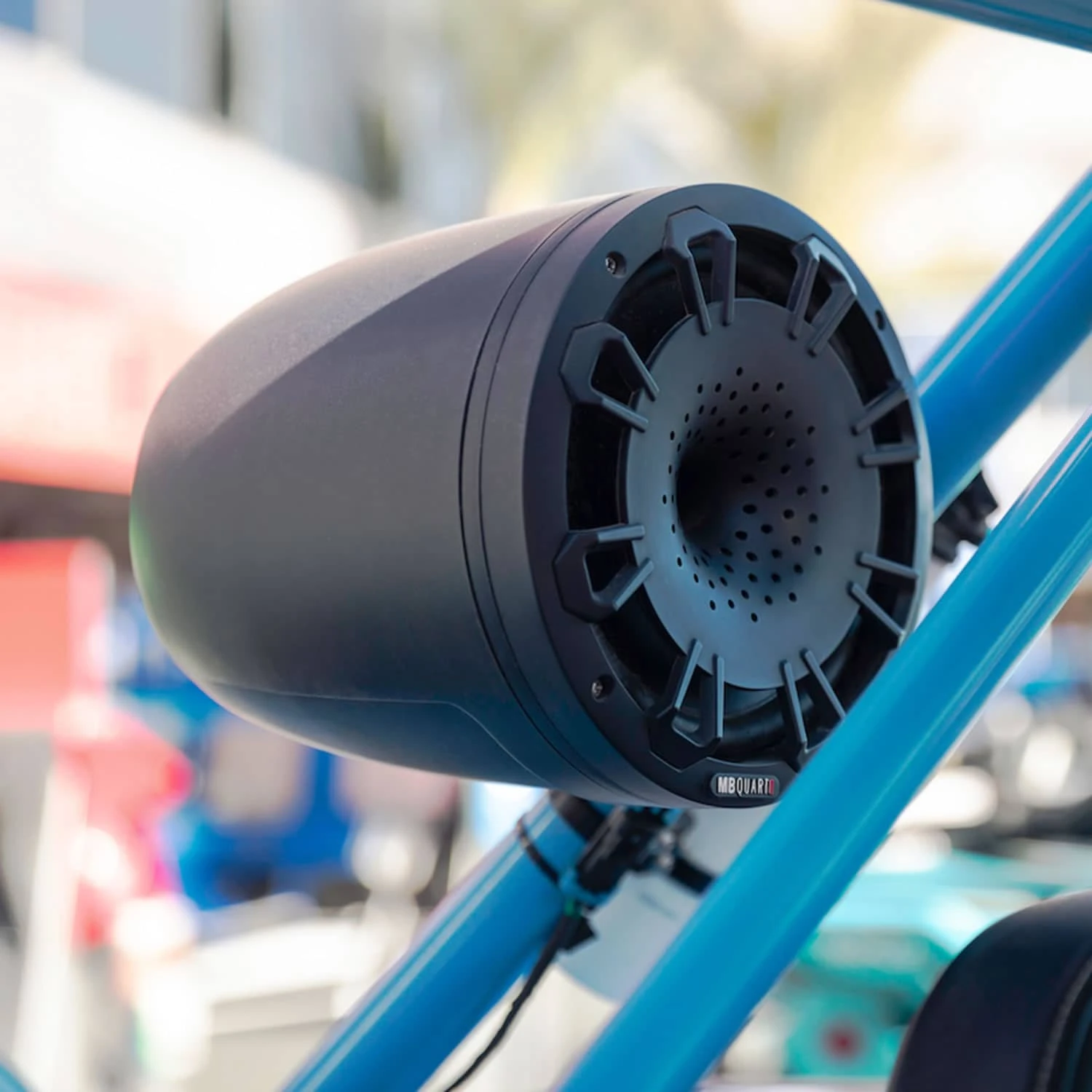 | Speaker Features | The front speakers are meticulously engineered to fit in the RZR kick panels. The entire system utilizes the MB Quart compression horn technology. (See inside here). This design assures that the system will be louder and better sounding than anything else on the trails. The rear (Pod) speakers are the exact speaker as the front, but mounted in a pair of versatile enclosure with the included swivel mounts for perfect alignment to the listener (regardless of the roll cage angle). |