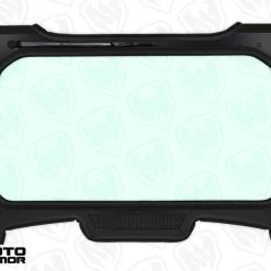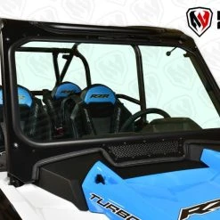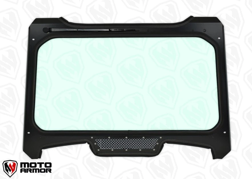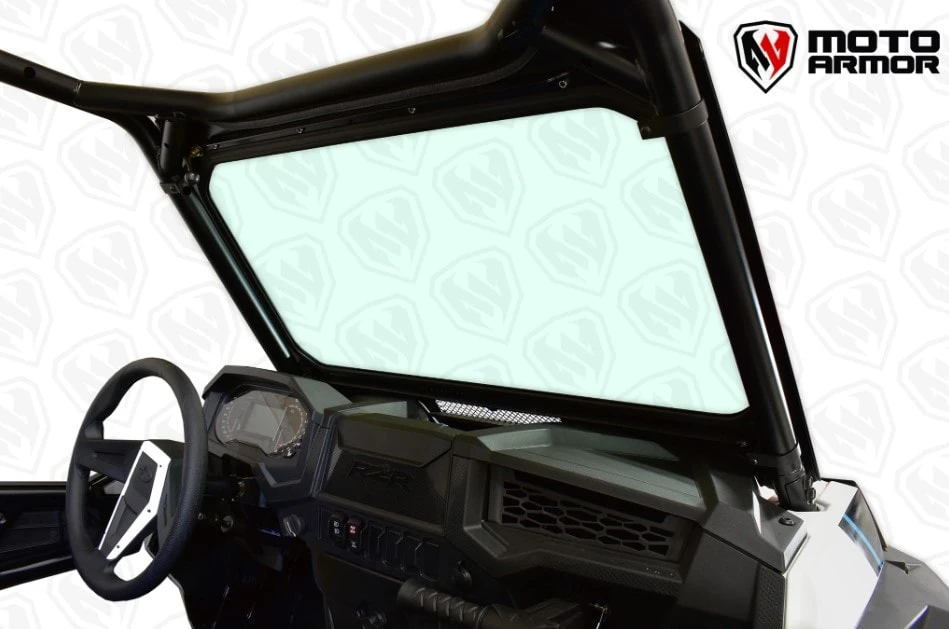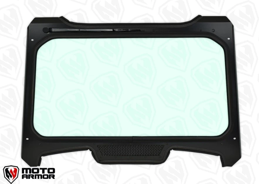 Moto Armor Full Glass Windshield for Polaris RZR TURBO S. Features the widest view possible offered in a glass windshield. Vent with woven stainless steel mesh helps keep cool and helps with dust in the cab.
