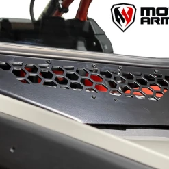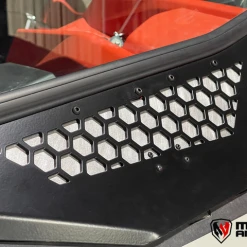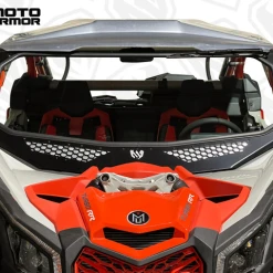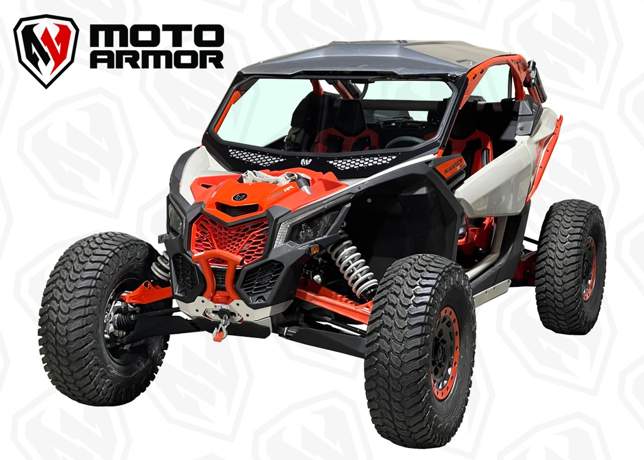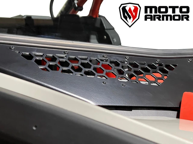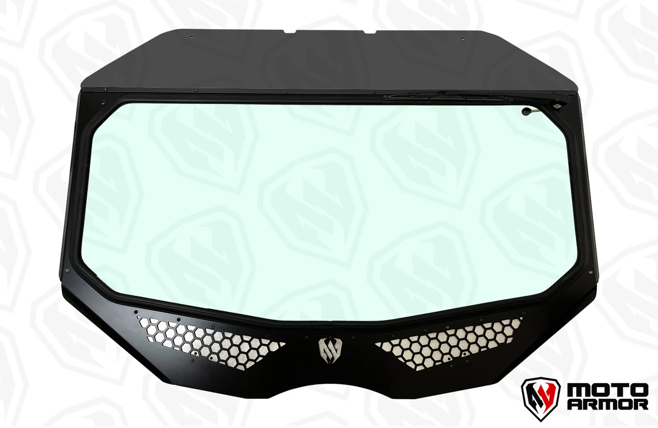 Moto Armor X3 Glass Windshield now features wider and taller glass than ever before. Honeycomb vent design not only looks great, but can open to allow airflow to help keep cool and keep the dust down. Dark tinted poly carb visor helps to increase the viewing area up top. Two pre-cut holes for manual windshield wipers, (one included).