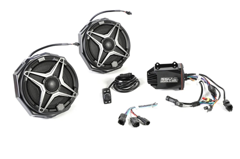 Everything in one box. No soldering, no cutting, no crimping! Simply bolt in the pre-installed speakers and pre-tuned amplifier with the included vehicle-specific plug & play wiring harness. This system features the best of Pro Armor & SSV Works to bring your side X side the cleanest, loudest, and most powerful Powersports audio system available… plus, it’s easy to install so you spend more time riding and less time wrenching.