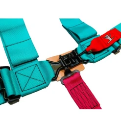 This 5-point harness with 3″ belts matches safety and comfort. The 5-point harness has sewn-in shoulder pads that stop chaffing on the neck and adds extra comfort, especially on long rides off-road. Includes all-black hardware for cool styling. The EZ adjusters allow you to adjust your shoulder straps quickly, even if they are dirty or muddy. Custom Shreddy Teal webbing makes this harness pop, with a black 5th point strap.