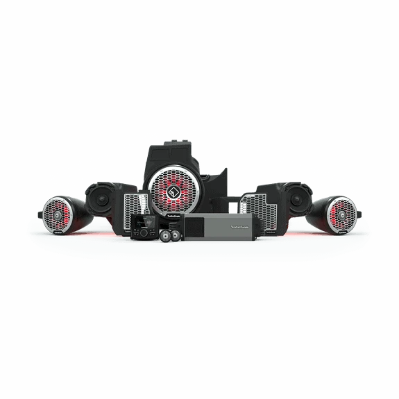 The Pro XP Stage 5 is a 1,500 watt audio system for Ride Command® takes entertainment to a new level with higher performance, louder output, and greater clarity while retaining your GPS navigation. This complete waterproof solution provides the ability to take your UTV into any environment. The subwoofer enclosure – vented to provide maximum bass performance – offers the ability to seal the vent when submerging the vehicle. The plug-and-play design requires minimal cutting or drilling by using OEM mounting points and features an easy to set-up “Rockford Fosgate” preset to optimize performance. The Color Optix™ control allows RGB color adjustment of speakers and rear moto-cans in addition to a Rockford Fosgate illuminated logo for a finishing touch to the passenger dash.