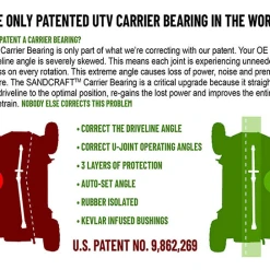 SANDCRAFT Motorsports has developed the only true solution for driveline vibration and premature wear. The SANDCRAFT Carrier Bearings use the patented auto-set angle feature to correct the driveline angle across multiple UTV platforms. Correcting the driveline angle results in less wear on the output of the transmission and the input of the front differential by eliminating the side loading of the bearings. The Carrier Bearing extends the life of the drivetrain. Our Carrier Bearings are fully GREASABLE while having 3 layers of protection to keep dirt, sand, mud and water out. The 2-piece design will dramatically lower installation time and routine maintenance. Correcting the angle of your driveline has never been easier.