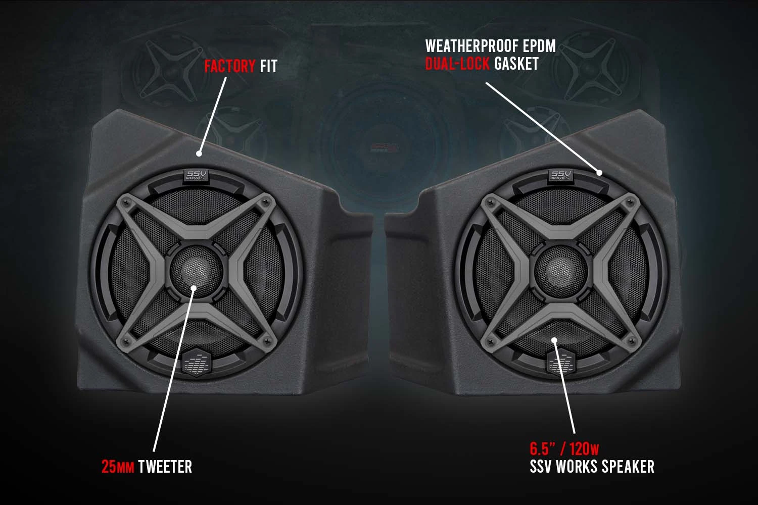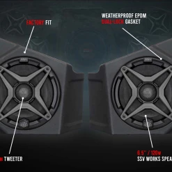 SSV Works is the first company to integrate audio in side-by-side. We have pioneered all the great features you find in audio systems today. From plug-&-play kit solutions, true weatherproof ratings, to factory fit and finishes, SSV has set the standard in UTV audio from the very beginning!