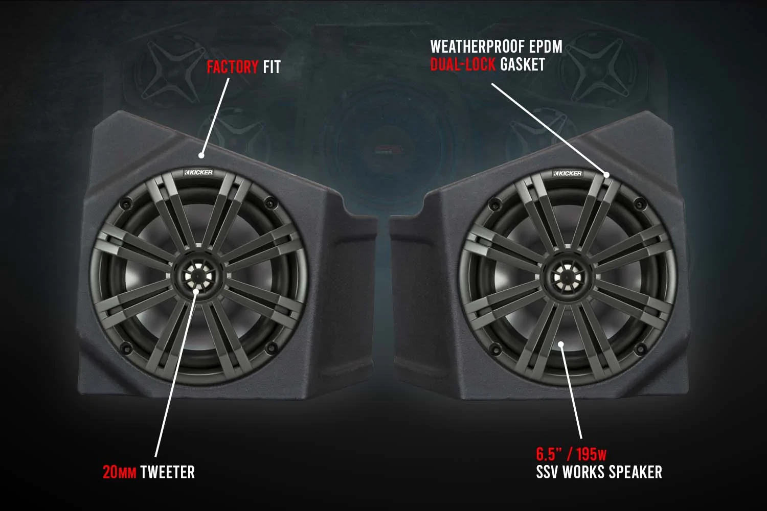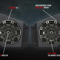 Trail Ready:Ā Built for the off-road environment, SSV Worksā audio components will withstand all the harsh riding conditions. From sand, dust, water or snow, you can ride your favorite trails without sacrificing premium audio from SSV Works.